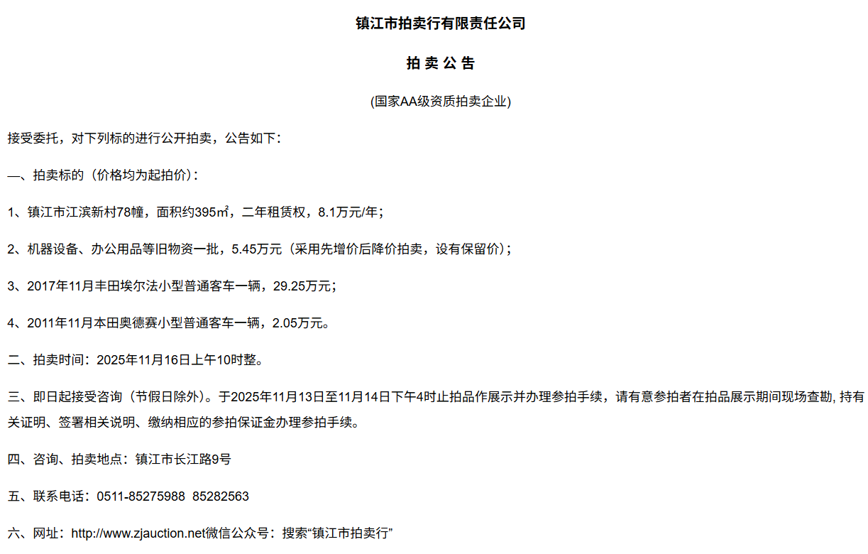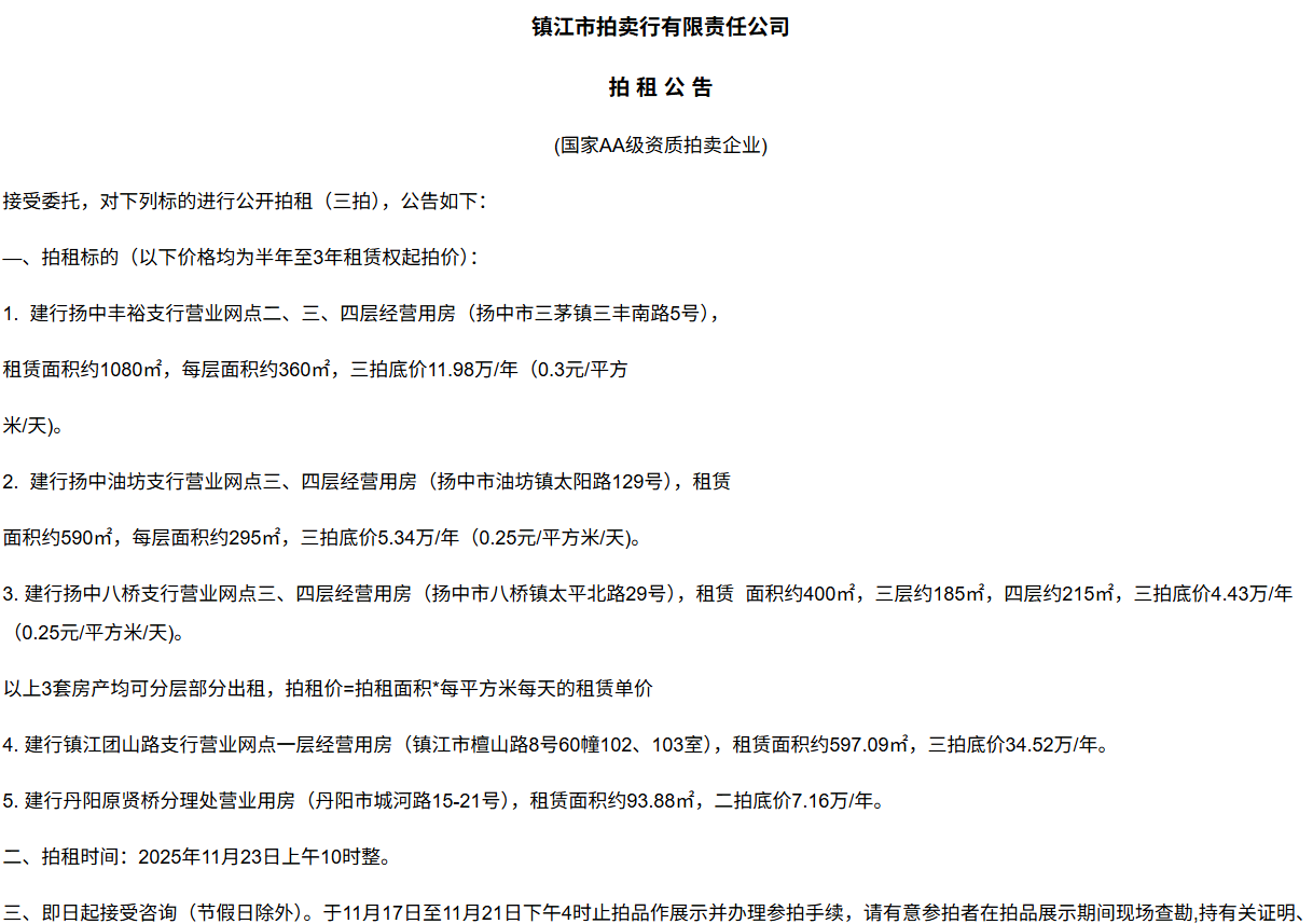 鎮江市拍賣行有限責任公司拍 租 公 吿(國家AA級資質拍賣企業)接受委托,對下列標的進行公開拍租(三拍),公告如下:—、拍租標的(以下價格均為半年至3年租賃權起拍價):1.  建行揚中豐裕支行營業網點二、三、四層經營用房(揚中市三茅鎮三豐南路5號),租賃面積約1080㎡,每層面積約360㎡,三拍底價11.98萬/年(0.3元/平方米/天)。2.  建行揚中油坊支行營業網點三、四層經營用房(揚中市油坊鎮太陽路129號),租賃面積約590㎡,每層面積約295㎡,三拍底價5.34萬/年(0.25元/平方米/天)。3. 建行揚中八橋支行營業網點三、四層經營用房(揚中市八橋鎮太平北路29號),租賃  面積約400㎡,三層約185㎡,四層約215㎡,三拍底價4.43萬/年(0.25元/平方米/天)。以上3套房產均可分層部分出租,拍租價=拍租面積*每平方米每天的租賃單價4. 建行鎮江團山路支行營業網點一層經營用房(鎮江市檀山路8號60幢102、103室),租賃面積約597.09㎡,三拍底價34.52萬/年。5. 建行丹陽原賢橋分理處營業用房(丹陽市城河路15-21號),租賃面積約93.88㎡,二拍底價7.16萬/年。二、拍租時間:2025年11月23日上午10時整。三、即日起接受咨詢(節假日除外)。于11月17日至11月21日下午4時止拍品作展示并辦理參拍手續,請有意參拍者在拍品展示期間現場查勘,持有關證明、簽署相關說明、繳納相應的參拍保證金辦理參拍手續。四、咨詢、拍租地點:鎮江市長江路9號五、聯系方式:0511-85275988   13655299933楊先生六、網址:http://www_zjauction_net.roseofaustralia.com;微信公眾號:搜索“鎮江市拍賣行” 拍品清單2025.11.23序號名稱起拍價(元)標的說明1建行揚中豐裕支行營業網點二、三、四層經營用房(揚中市三茅鎮三豐南路5號),租賃面積約1080㎡,每層面積約360㎡三拍底價11.98萬/年(0.3元/平方米/天)1、1-3號房產均可分層部分出租,拍租價=拍租面積*每平方米每天的租賃單價;2、意向競拍人在拍賣前需持營業執照或身份證與委托方說明租賃房產經營業態,確定意向后出具房產承租用途承諾書,經委托方審核后,方可交納保證金參加競拍;3、租賃期限為半年至3年(承租方與出租方協商而定),承租方每半年或一年結付租金,租賃期間的水、電費用及其它相關費用均由承租方承擔;4、承租方不得用于經營和保管危險物品,不得用于開設餐飲、娛樂等可能嚴重影響消防安全、運營安全的經營業態,不得用于經營委托貸款、小額貸款等可能冒用委托方名義,帶來聲譽風險的經營業態。租賃期內,承租方不得破壞墻體結構,自行成就消防、安全等使用條件,不得擅自將租賃房屋轉租、轉讓給他人使用,否則委托方有權收回房屋;5、拍租成交后,承租方將租金交至出租方指定賬戶,傭金交至拍賣方賬戶(拍租傭金為該房屋一個月租金)。承租方憑租賃合同無息退還保證金。2建行揚中油坊支行營業網點三、四層經營用房(揚中市油坊鎮太陽路129號),租賃面積約590㎡,每層面積約295㎡三拍底價5.34萬/年(0.25元/平方米/天)3建行揚中八橋支行營業網點三、四層經營用房(揚中市八橋鎮太平北路29號),租賃面積約490㎡,每層面積約245㎡三拍底價4.43萬/年(0.25元/平方米/天)4建行鎮江團山路支行營業網點一層經營用房(鎮江市檀山路8號60幢102、103室),建筑面積約597.09㎡三拍底價34.52萬/年5建行丹陽原賢橋分理處營業用房(丹陽市城河路15-21號),建筑面積約93.88㎡二拍底價7.16萬/年